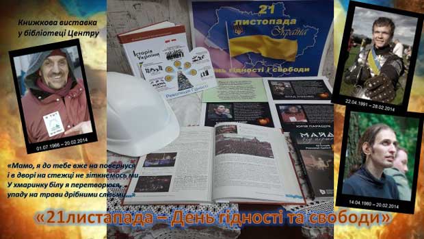 З нагоди Дня Гідності та Свободи в бібліотеці Центру розгорнуто книжкову виставку та виставку фотографій. На виставці представлено фотодокументи про історичні події: фотографії харків’ян, які загинули на майдані, міні-плакат «Революція гідності», на якому представлені хронологія подій 2013 року та кількість учасників. На виставці експонується також книга «Майдан від першої особи. 45 історій Революції гідності», в якій зібрані фрагменти спогадів учасників протестних акцій, що відбулися в Україні з 21 листопада 2013 року до 22 лютого 2014 року і названі Революцією гідності, матеріали підручника Історія України (11 клас).