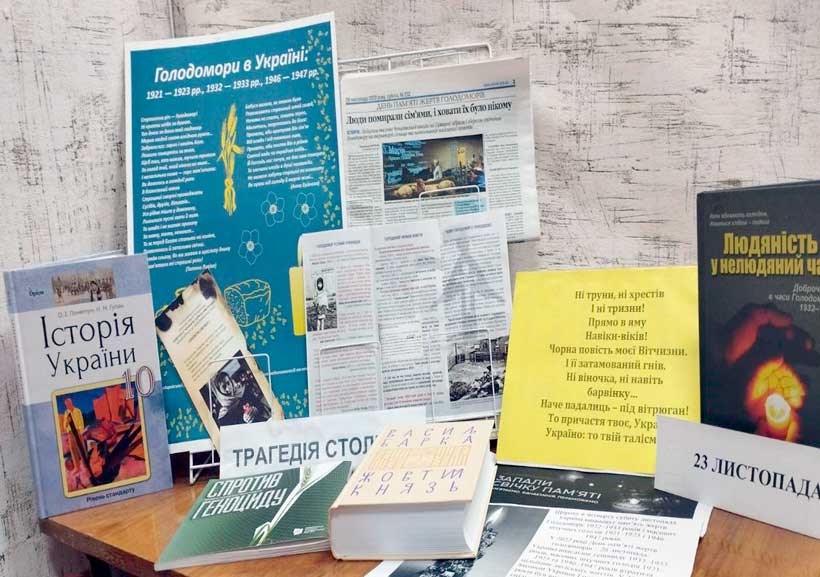 На виставці представлено спогади людей, які пережили Голодомор, добірка матеріалів про причини і наслідки та історії Голодомору; книги: В. Барки «Жовтий князь», «Людяність у нелюдяний час» (доброчинці часів голодомору 1932-1933), «Супротив геноциду» (книга-виставка, яку підготував Інститут національної пам’яті України) та ін. З матеріалами виставки можна ознайомитися на сторінці бібліотеки на сайті Центру у розділі «Масова робота» та на абонементі у бібліотеці.